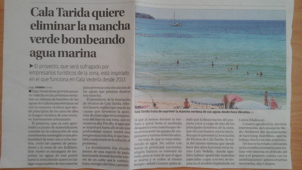 Les pouvoirs publics ayant pris conscience de la dégradation de l'eau à la Cala Tarida pendant la saison haute vont mettre en place à partir de cette année un système de pompes qui servira à brasser l'eau et éviter l'apparition des algues microscopiques (tâches vertes). Ce système déjà exploité à Cala Vadella depuis 2013 semble améliorer la situation.